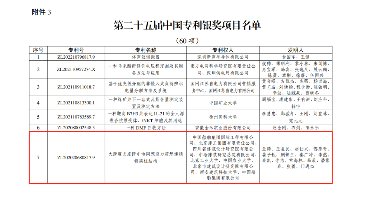 今年6月,國家知識產(chǎn)權(quán)局公布第二十五屆中國專利獎授獎決定,由中船集團(tuán)旗下中船國際工程主導(dǎo)申報的專利《大跨度支座跨中協(xié)同預(yù)應(yīng)力箱形連續(xù)鋼梁柱結(jié)構(gòu)》(專利號:ZL202020680817.9)榮獲本屆中國專利銀獎。該獎項由國家知識產(chǎn)權(quán)局與世界知識產(chǎn)權(quán)組織聯(lián)合設(shè)立,是我國專利領(lǐng)域的最高榮譽(yù)。今天,讓我們走進(jìn)中船國際工程鋼結(jié)構(gòu)工程設(shè)計與研發(fā)團(tuán)隊,聆聽他們的奮斗故事。