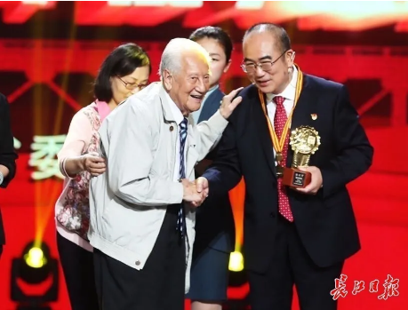 當主持人念出“給‘人民英雄’張定宇頒獎的是‘共和國勛章’獲得者黃旭華”時,臺下爆發出熱烈的掌聲。