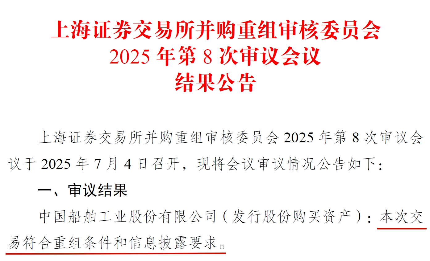 7月4日,上海證券交易所并購重組審核委員會(huì)2025年第8次審議會(huì)議召開,審議結(jié)果為中國船舶工業(yè)股份有限公司(發(fā)行股份購買資產(chǎn)):本次交易符合重組條件和信息披露要求。