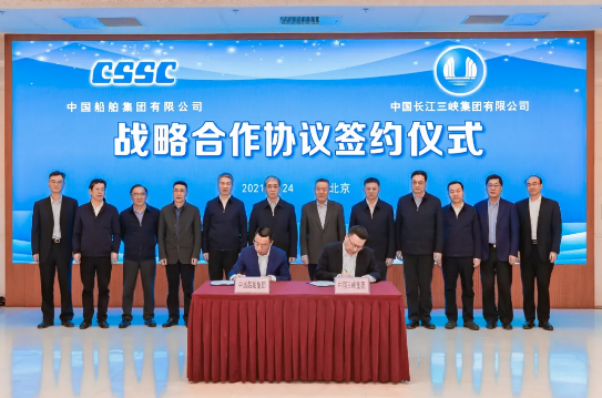 2月24日,中國船舶集團有限公司與中國長江三峽集團有限公司在京簽署戰略合作框架協議。中國船舶集團黨組書記、董事長雷凡培,三峽集團黨組書記、董事長雷鳴山出席簽約儀式。中國船舶集團黨組成員、副總經理盛紀綱,三峽集團黨組成員、副總經理王良友分別代表雙方在協議上簽字。