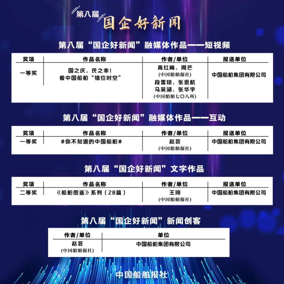 1月11日,第八屆“國企好新聞”獲獎作品正式揭曉,中國船舶集團斬獲4項大獎,涵蓋系列報道、短視頻、融媒體作品等多種體裁。其中,一等獎2項、二等獎1項,并首次榮膺十大新聞創客獎,獲獎名單如下: