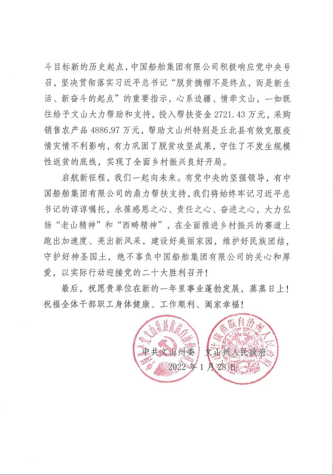 春節前夕,中國船舶集團陸續收到云南省委省政府、文山州委州政府、鶴慶縣委縣政府、勐臘縣政府發來的感謝信,對集團公司長期以來給予鶴慶縣、勐臘縣、丘北縣的傾力幫扶表示衷心感謝和崇高敬意。