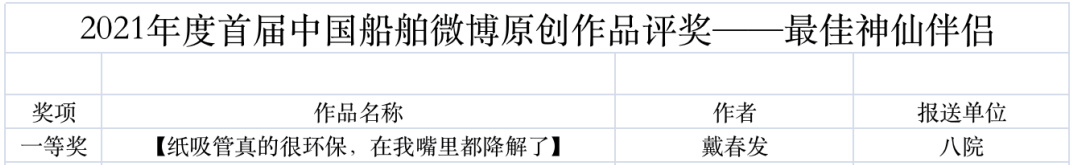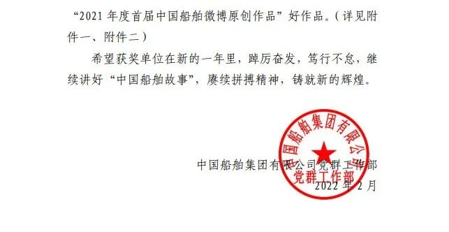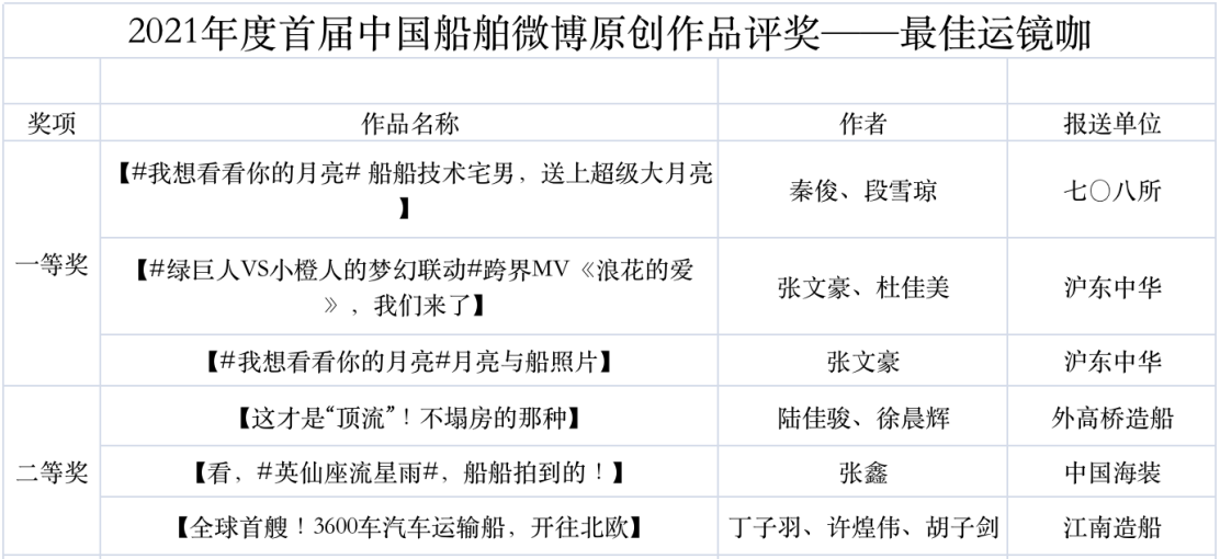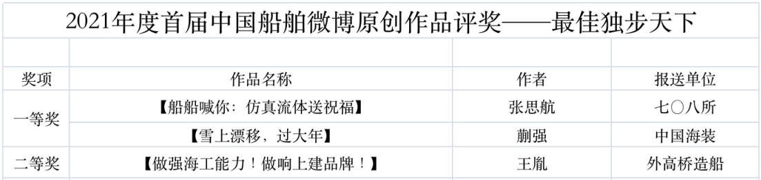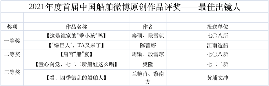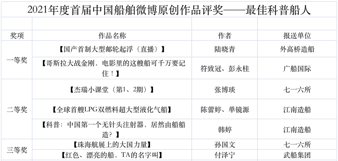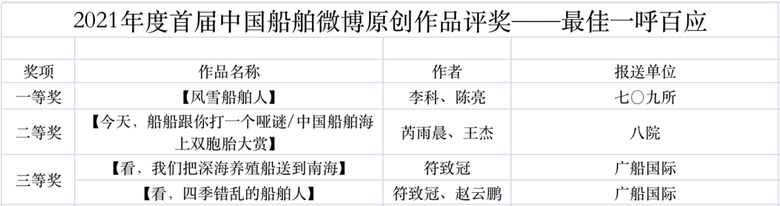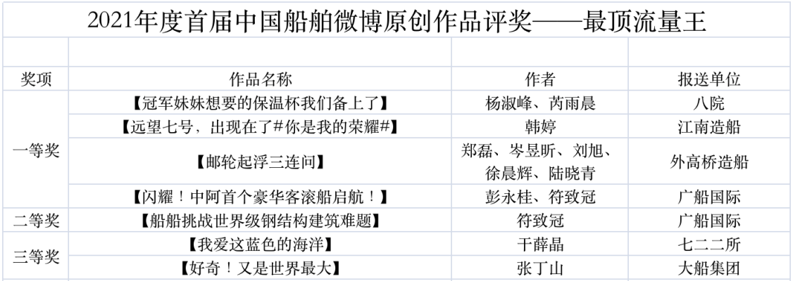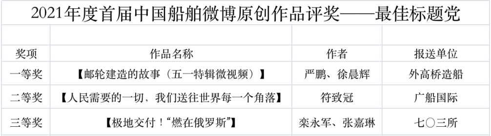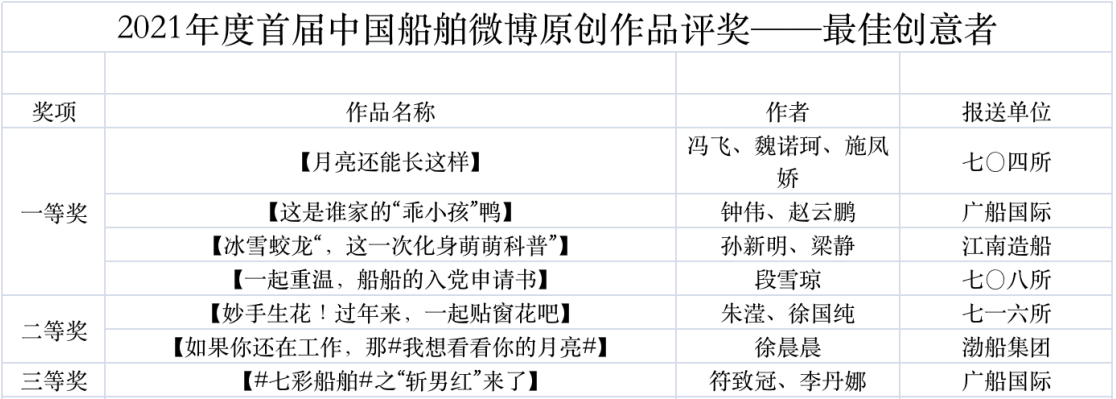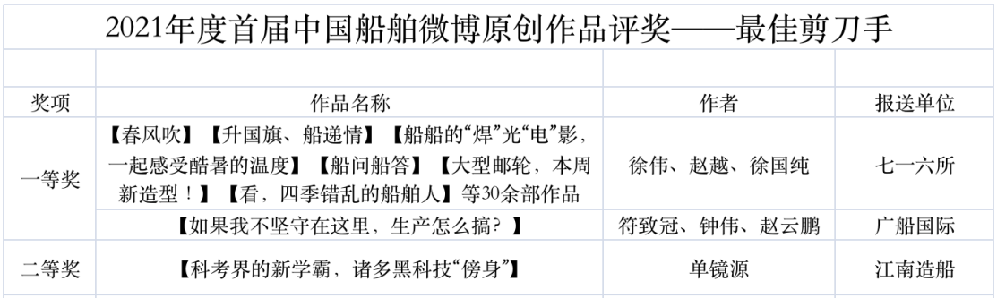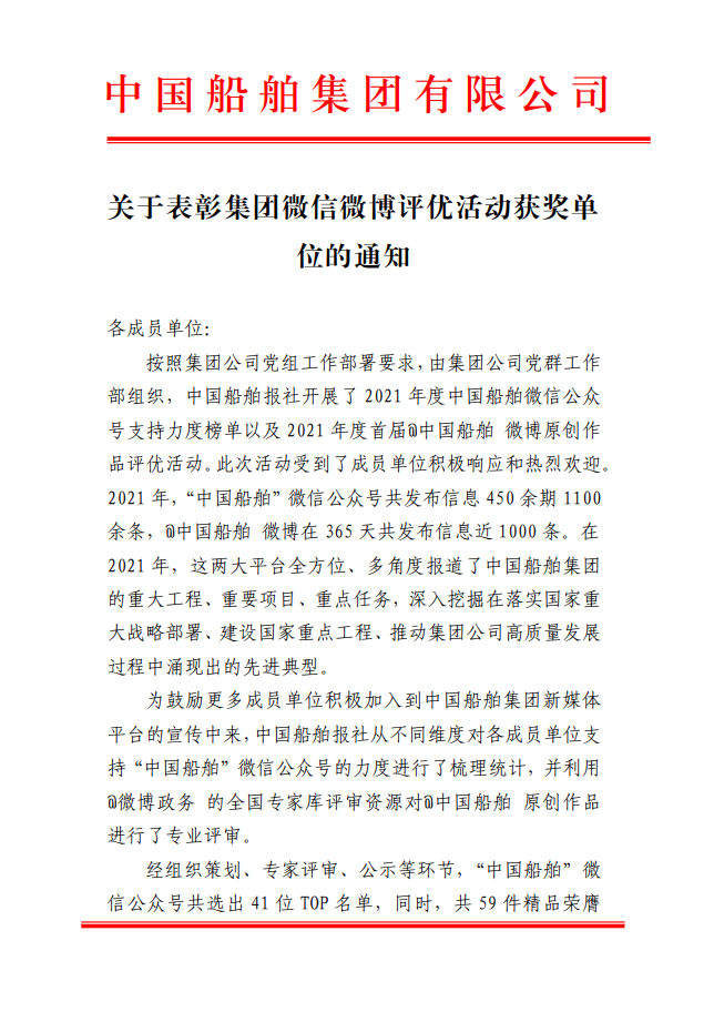 為鼓勵更多成員單位積極加入到中國船舶集團新媒體平臺的宣傳中來,在集團公司黨群工作部的指導(dǎo)下,中國船舶報社從不同維度,對2021年度各單位支持“中國船舶”微信的力度進(jìn)行了梳理統(tǒng)計,并利用微博政務(wù)的全國專家?guī)煸u審資源,對2021年度“中國船舶”微博原創(chuàng)作品進(jìn)行了專業(yè)評審,評選結(jié)果公布如下: