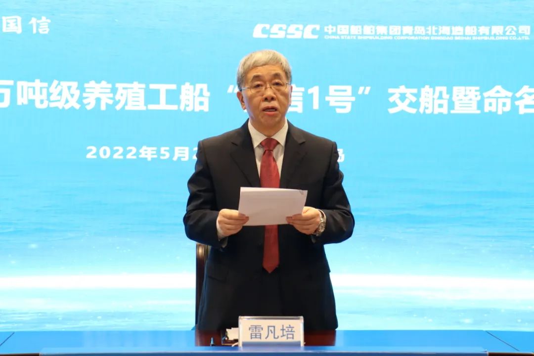 雷凡培在致辭中表示,中國船舶集團作為我國船舶工業的骨干力量和海洋裝備發展的引領力量,一直將推動我國高端海洋漁業裝備建設和助力我國深遠海養殖產業發展作為重要使命和責任。2019年,中國船舶集團向中央提出開展深遠海養殖示范工程等建議,得到了中央領導批示和國家有關部委的大力支持。本次交付的養殖工船項目,是中國船舶集團落實國家深遠海養殖示范工程的重要舉措,也是貫徹落實國家海洋強國戰略、服務生態文明建設和維護國家糧食安全的具體實踐。“國信1號”是全球首艘10萬噸級養殖工船,集深海養殖先進經驗、現代化環保養殖理念和海洋工程裝備尖端技術于一身,跨領域集成創新,實現了全球深遠海漁業大型智能養殖裝備的重大突破,創造了養殖漁船單船噸位最大、單船養殖規模最大、單艙水體量最高等多項國內外紀錄,開創了智慧養殖新模式,其前瞻性、引領性、創新性向世界提供了深遠海養殖的“中國方案”。