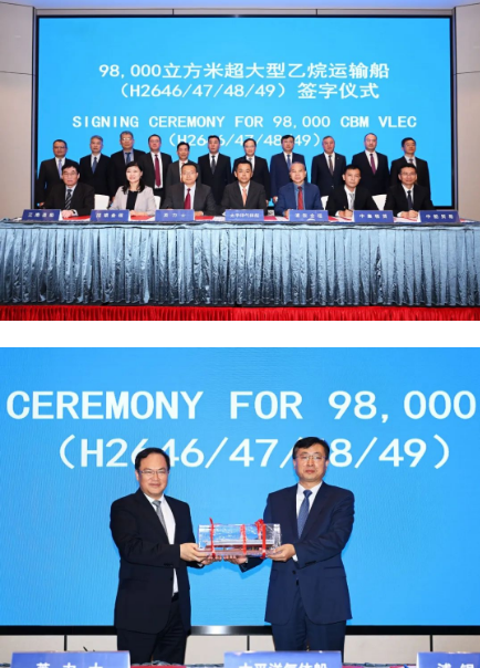 11月2日,中國船舶集團旗下江南造船(集團)有限責任公司承建的,山東海洋集團下屬太平洋氣體船4艘超大型乙烷運輸船項目簽約儀式在上海舉行。中國船舶集團黨組副書記、總經理楊金成,黨組成員、副總經理孫偉,山東海洋集團黨委書記、董事長姜國棟,黨委委員、副總經理于冰出席儀式。