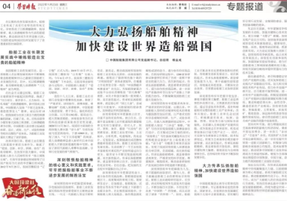 11月23日,中共中央黨校主辦的以思想理論宣傳為主旨的中央級(jí)大報(bào)《學(xué)習(xí)時(shí)報(bào)》刊發(fā)了中國(guó)船舶集團(tuán)有限公司黨組副書記、總經(jīng)理?xiàng)罱鸪墒鹈恼隆洞罅霌P(yáng)船舶精神 加快建設(shè)世界造船強(qiáng)國(guó)》。