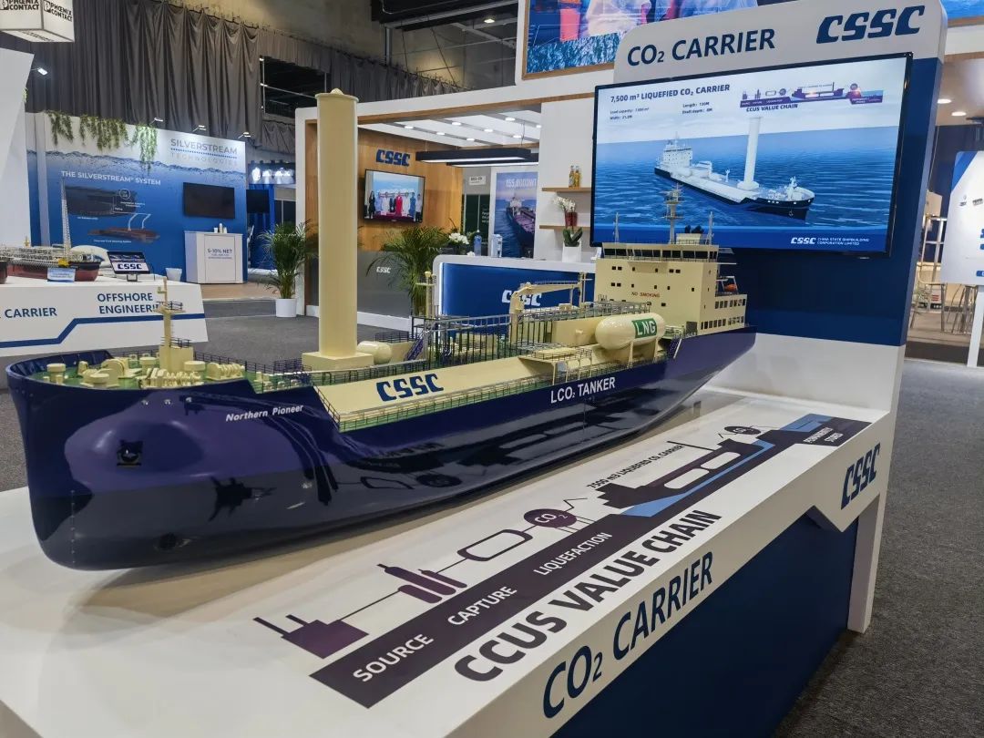 本次展會,中國船舶集團積極踐行“走出去”發展戰略,緊盯目標市場特點和需求,重點展示了近年來船舶海工及動力機電產品在綠色、低碳、環保方面取得的最新進展和相關成果,包括全球首制7500立方米液態二氧化碳運輸船、17.4萬立方米大型LNG運輸船、7000CEU雙燃料汽車滾裝船、23000TEU超大型雙燃料集裝箱船、21萬噸氨燃料散貨船、30萬噸級FPSO、全球首艘10萬噸級智慧養殖工船,以及 12X92DF雙燃料低速機、LNG供氣系統、船用碳捕捉系統等。集團公司展臺吸引了眾多國內外知名船東、船級社、設備廠商等到訪觀摩,交流了當前市場熱點并探討了未來合作機遇。
