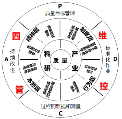 七二五所結合自身軍工科研和科技產業“一所兩制”的特點,凝練形成了一套目標明確(P)、標準作業(D)、監管有效(C)、螺旋上升持續改進(A)的“四維”質量管理模式。該模式沿著精神層、制度層、行為層和本質層四個維度實施質量建設和管控。精神層是“核心”層,體現了七二五所人對質量價值的精神追求,通過質量文化創建、內外部宣傳教育來牢固樹立四維質量管理的理念。制度層是“法制”層,以制度形式規范質量行為、工藝標準。建立覆蓋四大板塊的多行業立體式管理體系,形成47個特色制度,保障四維質量管理模式的有效實施。行為層是“實施”層,通過質量提升模型和雙零班組建設開展實施,反映了七二五所人對質量文化精神維度的理解和對制度維度的遵守。本質層是“目的”層,是四維質量管理輸出的目標產物,反映了產品、服務的本質質量。