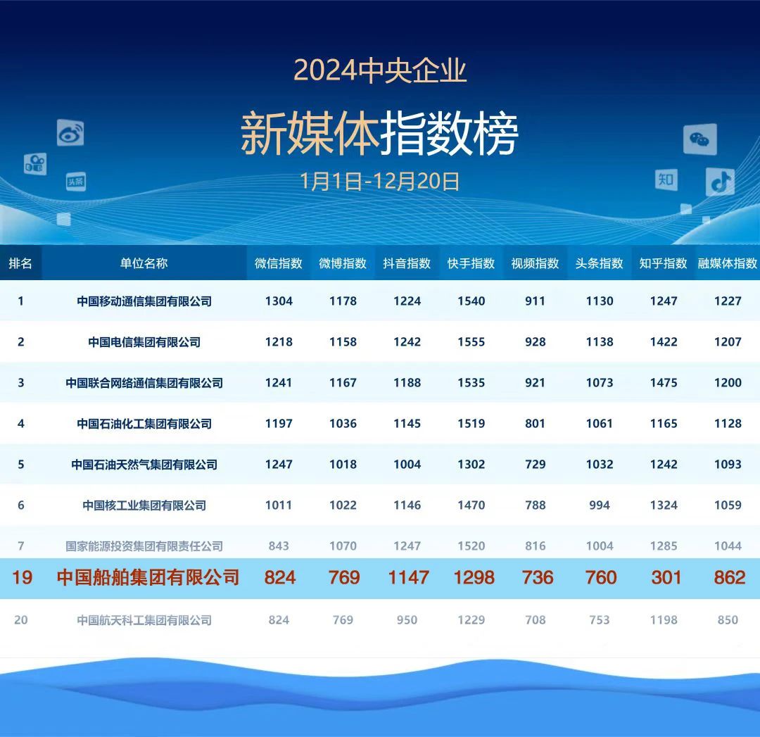 2024年——中船集團新媒體平臺綜合指數(shù)進入2024年度中央企業(yè)新媒體指數(shù)榜前20!
