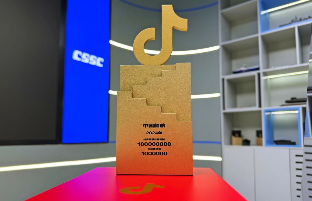 2024年,“中國船舶”抖音號獲得“播放量突破 100000000”“粉絲量突破 1000000”榮譽。