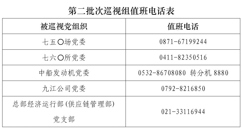 巡視期間,集團(tuán)公司黨組巡視組設(shè)置值班電話和聯(lián)系信箱,主要受理反映被巡視黨組織領(lǐng)導(dǎo)班子及其成員、下一級(jí)黨組織領(lǐng)導(dǎo)班子主要負(fù)責(zé)人和重點(diǎn)崗位領(lǐng)導(dǎo)干部問題的來信、來電、來訪,重點(diǎn)關(guān)注違反政治紀(jì)律、組織紀(jì)律、廉潔紀(jì)律、群眾紀(jì)律、工作紀(jì)律、生活紀(jì)律以及巡視整改等方面問題反映。第二批次巡視受理信訪截止時(shí)間為8月18日。