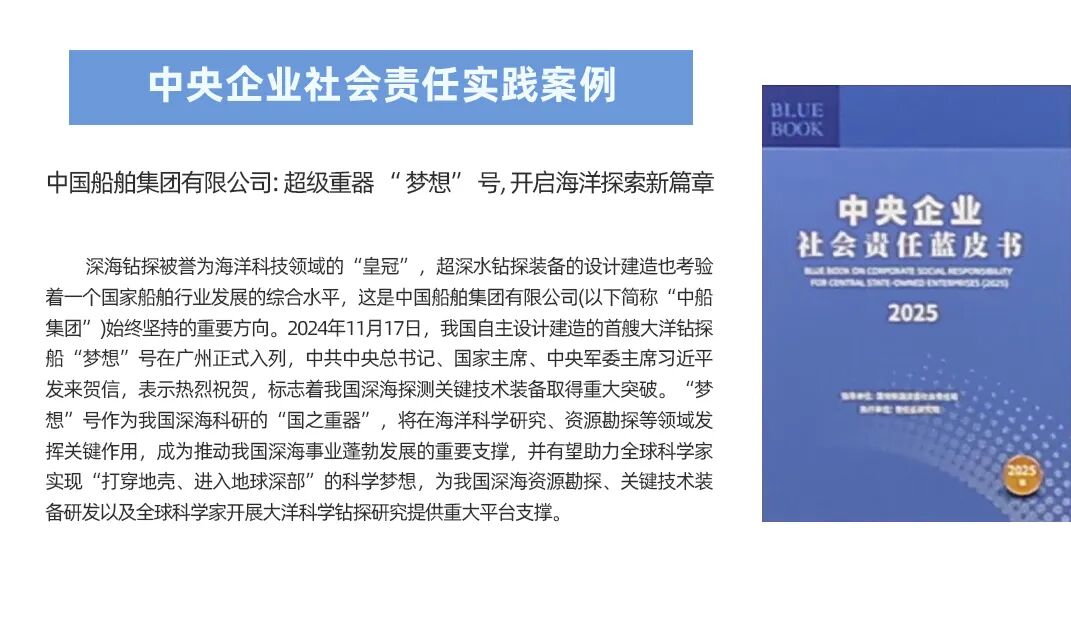 中船集團(tuán)申報(bào)的《超級(jí)重器“夢(mèng)想”號(hào),開啟海洋探索新篇章》,聚焦國之重器建造歷程,闡述了“夢(mèng)想”號(hào)在海洋科學(xué)研究、深海資源勘探等領(lǐng)域的關(guān)鍵作用,成功入選《中央企業(yè)社會(huì)責(zé)任藍(lán)皮書(2025)》中央企業(yè)社會(huì)責(zé)任實(shí)踐案例。