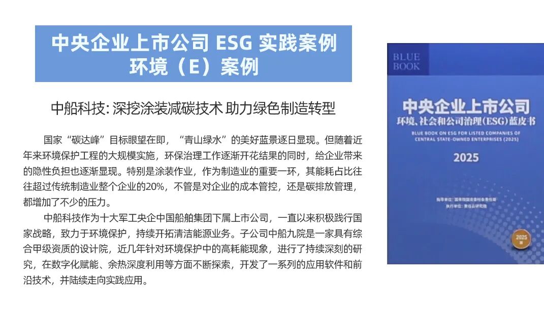 中船集團(tuán)旗下上市公司中船科技申報(bào)的《深挖涂裝減碳技術(shù) 助力綠色制造轉(zhuǎn)型》,聚焦環(huán)保治理工作,以技術(shù)創(chuàng)新助力產(chǎn)業(yè)轉(zhuǎn)型,為行業(yè)綠色發(fā)展提供了實(shí)踐示范,成功入選《中央企業(yè)上市公司環(huán)境、社會(huì)和公司治理(ESG)藍(lán)皮書(2025)》環(huán)境(E)案例。
