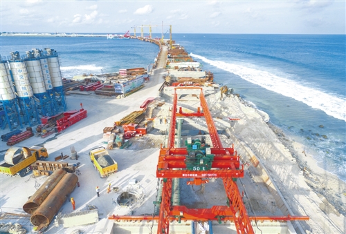 這是7月6日在馬爾代夫航拍的建設中的中馬友誼大橋。隨著主橋23號墩承臺最后一車混凝土的澆筑,中國援馬爾代夫中馬友誼大橋5個主橋承臺6日全部施工完成,標志著占全橋施工總量約70%的主橋部分從此徹底擺脫印度洋的強涌浪襲擾,進入上部結構施工階段。