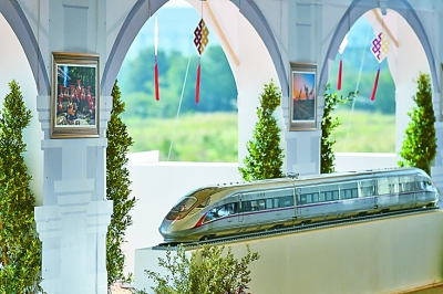 在開工儀式上展出的中國“復(fù)興號”高鐵列車模型。新華社發(fā)