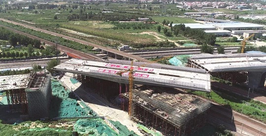 ????該工程上跨鄭焦城際、京廣鐵路等3條線5股道,每天有140對高鐵列車和貨運列車擦肩而過,轉(zhuǎn)體橋與鐵路線的最近距離只有8.7米,加上該工程橋梁全長317米,寬38.7米,轉(zhuǎn)體懸臂長71.75米,單側(cè)轉(zhuǎn)體橋梁重達(dá)3萬噸,鐵路東、西兩側(cè)轉(zhuǎn)體橋梁總重達(dá)6萬噸,體量大,風(fēng)險高,施工難度可想而知。為確保總重量達(dá)6萬噸的轉(zhuǎn)體橋精準(zhǔn)對接,重點在于球鉸的制作、安裝,轉(zhuǎn)體過程中應(yīng)力應(yīng)變、位移與線性的實時監(jiān)測。本次成功應(yīng)用的轉(zhuǎn)動體系采用鋼球鉸,由雙瑞特裝設(shè)計、制造、安裝及轉(zhuǎn)體施工,解決了大噸位橋梁轉(zhuǎn)體裝置超大承載力,靈活轉(zhuǎn)動的難題。