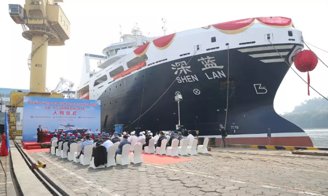 ????11月24日,青島海洋科學(xué)與技術(shù)試點(diǎn)國(guó)家海洋實(shí)驗(yàn)室(以下簡(jiǎn)稱“海洋試點(diǎn)國(guó)家實(shí)驗(yàn)室”)在黃埔文沖船舶有限公司舉行了我國(guó)首艘漁業(yè)捕撈加工一體船“深藍(lán)號(hào)”入列國(guó)家海洋實(shí)驗(yàn)室遠(yuǎn)海科學(xué)考察船隊(duì)儀式。
