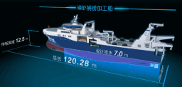 ????“深藍(lán)號(hào)”由黃埔文沖建造,七〇八所參與設(shè)計(jì),總長(zhǎng)約120米,型寬21.6米,設(shè)計(jì)吃水7.3米,設(shè)計(jì)航速15節(jié),主機(jī)功率8000 千瓦,載重噸約5000噸。“深藍(lán)號(hào)”是我國(guó)自主研制建造的第一艘漁業(yè)捕撈加工一體船,也是目前最大最先進(jìn)的漁業(yè)捕撈加工一體船,取得近200項(xiàng)知識(shí)產(chǎn)權(quán)保護(hù),實(shí)現(xiàn)了我國(guó)現(xiàn)代化漁業(yè)船舶裝備領(lǐng)域的重大突破,達(dá)到世界先進(jìn)水平;主要用于南大洋漁業(yè)捕撈,兼顧海洋科考功能,可滿足ICE-A冰區(qū)(冰厚度0.8米)及-25℃低溫環(huán)境的營(yíng)運(yùn)要求。