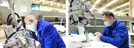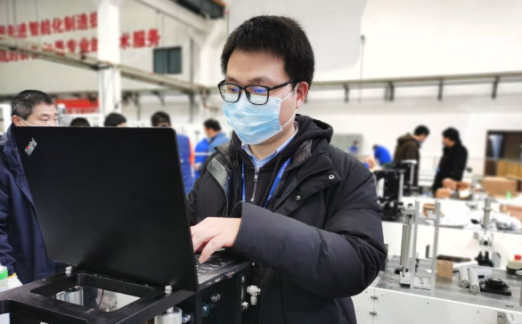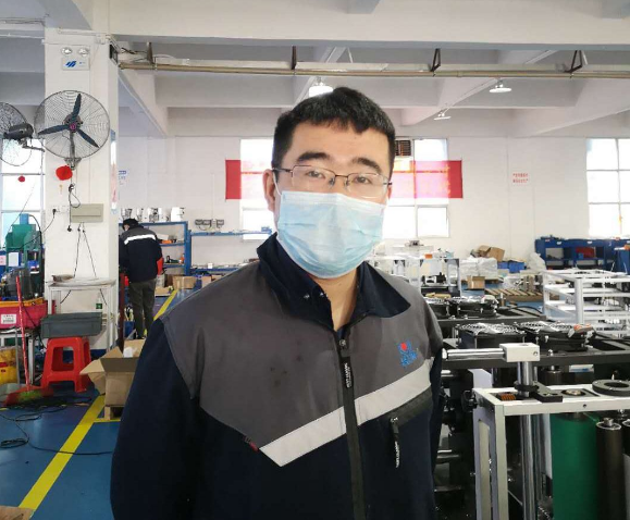 ????徐存培是平面口罩機(jī)項(xiàng)目的技術(shù)負(fù)責(zé)人。自接到平面口罩機(jī)研制任務(wù)以來,他幾乎就“長”在公司里了。他穿梭在各臺平面口罩機(jī)間,一會兒墊腳測量放料架距離地面的高度,一會兒彎腰擰緊設(shè)備柜里的螺絲,一會兒又緊盯著傳送帶,看無紡布貼合的角度是否精準(zhǔn)無誤……