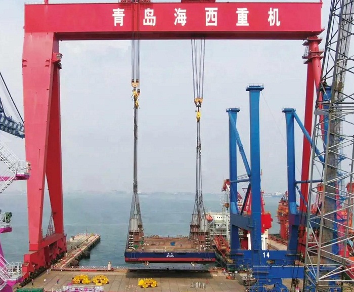 ????在該項目的前期建造策劃階段,海西重機沒有采用常規船塢下水或滑移下水方式,而是大膽提出利用1600噸龍門吊整體吊裝下水的設想。經過一系列重量預估及方案論證,最終核定吊裝下水重量接近1440噸。