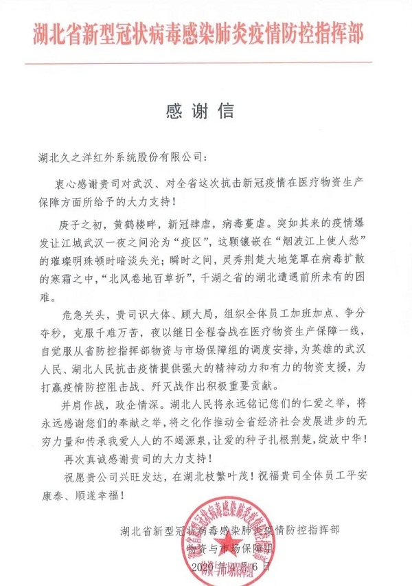 ????信中,對中國船舶集團七一七所所屬湖北久之洋紅外系統股份有限公司在抗擊新冠肺炎疫情工作中,在醫療物資生產保障方面給予的大力支持表示感謝。
