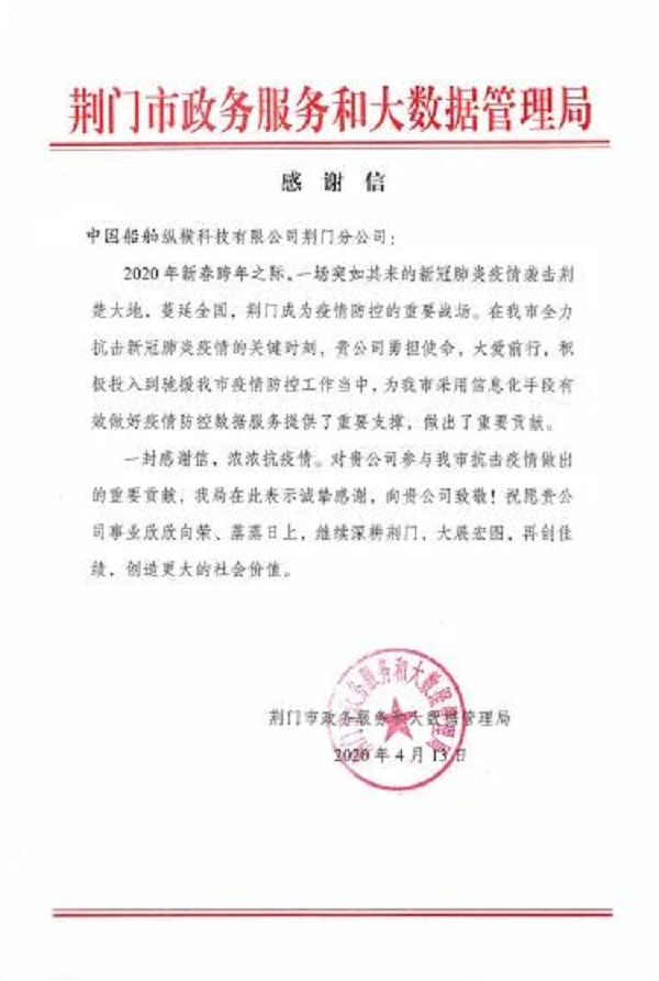 ????中國船舶集團七一〇所縱橫公司荊門分公司收到荊門市政務服務和大數據管理局寄來的感謝信,感謝其在抗擊新冠肺炎疫情的關鍵時刻,為荊門市采用信息化手段有效做好疫情防控數據服務提供了重要支撐,作出了重要貢獻。