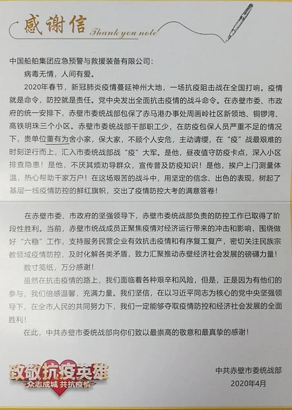 ????中共赤壁市委統戰部特向中國船舶集團旗下中國應急發來感謝信,對中國應急員工董有為舍小家保大家,不顧個人安危,主動請纓,在戰“疫”最艱難的時刻逆行而上表示感謝和致敬。
