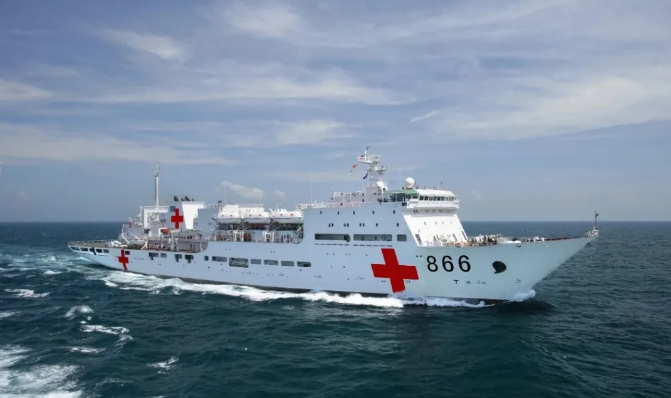 這是一艘特殊的軍艦,在人民海軍的序列里,她是唯一。她的甲板上,沒有艦炮、魚雷,沒有導彈、火箭;她的“裝備”是手術室、病房、血庫;她的“武器”是CT機、X光機、藥品、醫療器械;她最醒目的標志是通體的白色和船舷上大大的紅十字。