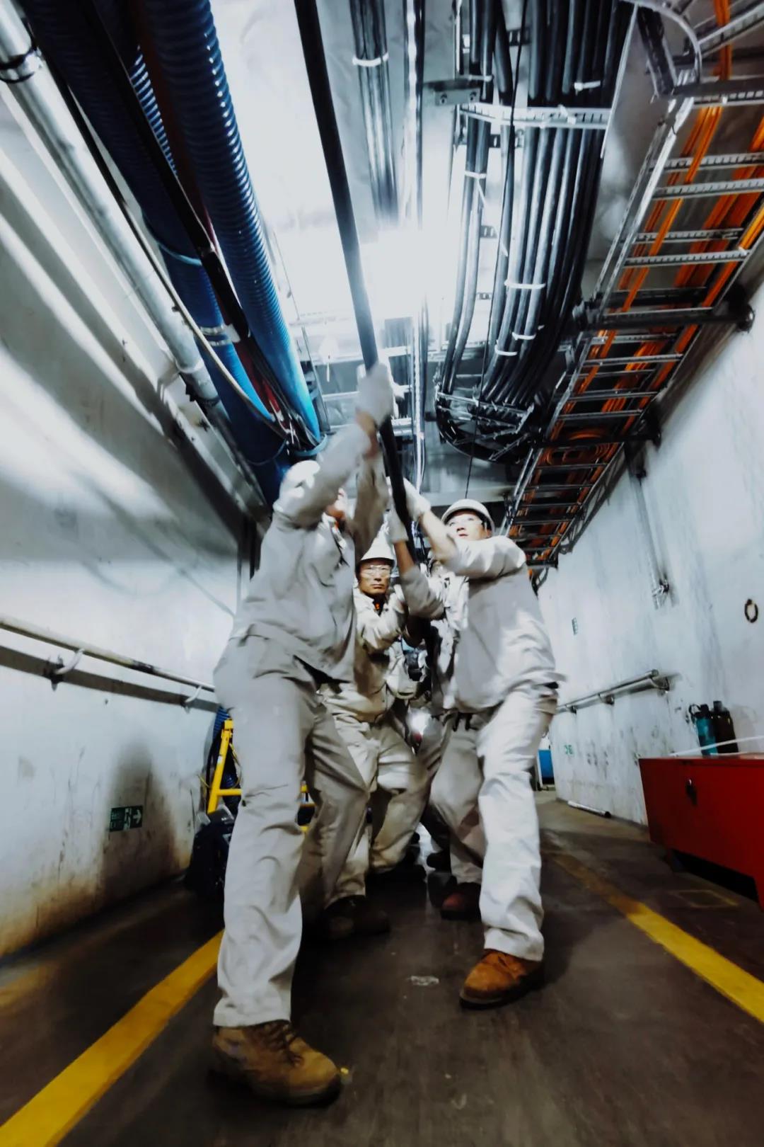 目前已完成全船總段制作和搭載的首制國產(chǎn)大型郵輪H1508很快將迎來全船結(jié)構(gòu)貫通,外高橋造船的工人們正在艙內(nèi)加班加點抓緊敷設(shè)電纜。