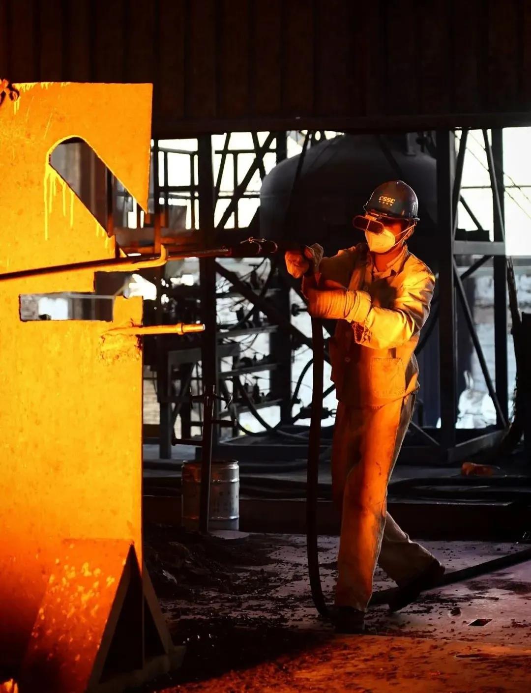 煉鋼工人為確保鋼水質(zhì)量,提高生產(chǎn)效率進(jìn)行吹氧工序,鋼水溫度達(dá)1600余攝氏度。