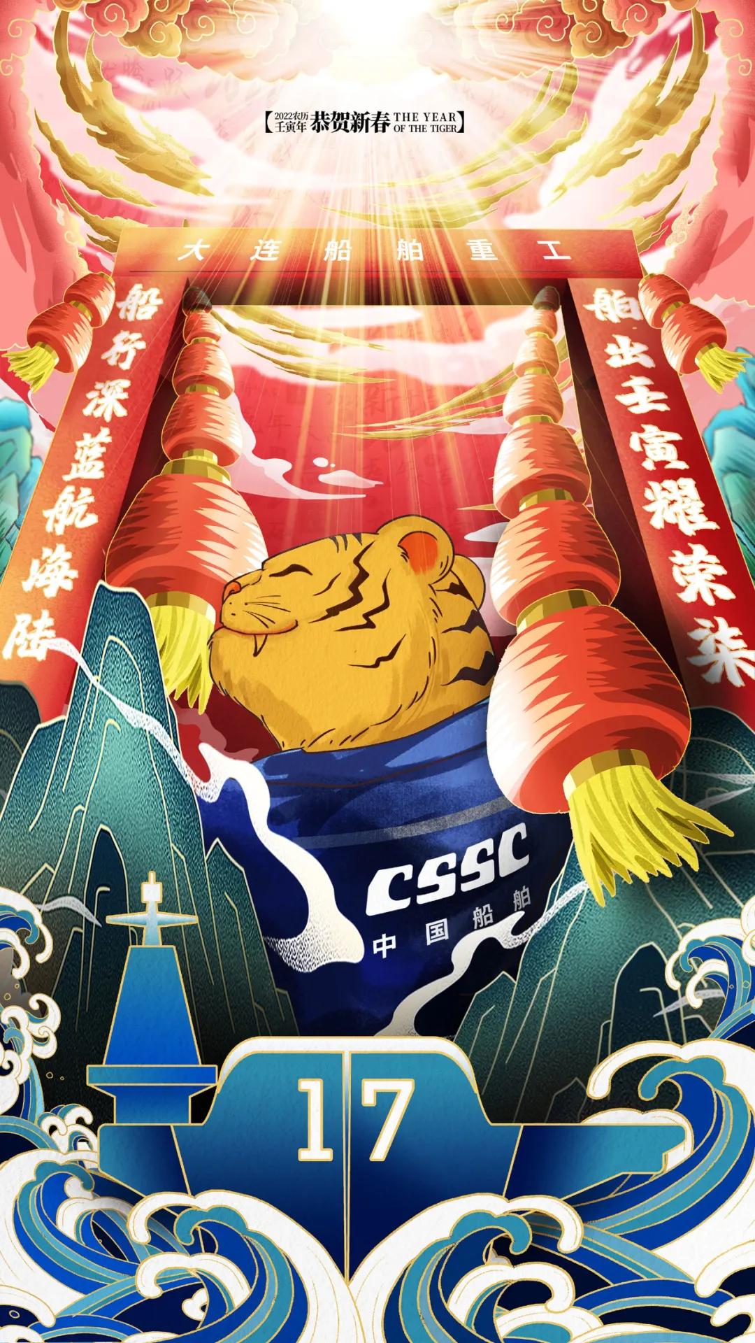 海報(bào)采用國(guó)潮設(shè)計(jì),富有層次感。航海陸對(duì)應(yīng)遼寧艦舷號(hào)16,耀榮柒對(duì)應(yīng)山東艦舷號(hào)17;兩座山則是對(duì)應(yīng)遼寧半島、山東半島;龍門架將兩座山連接,建造了兩艘航母;龍門架后是漫漫長(zhǎng)路;身穿中國(guó)船舶服裝的壬寅虎保持自信的微笑,堅(jiān)定未來路。