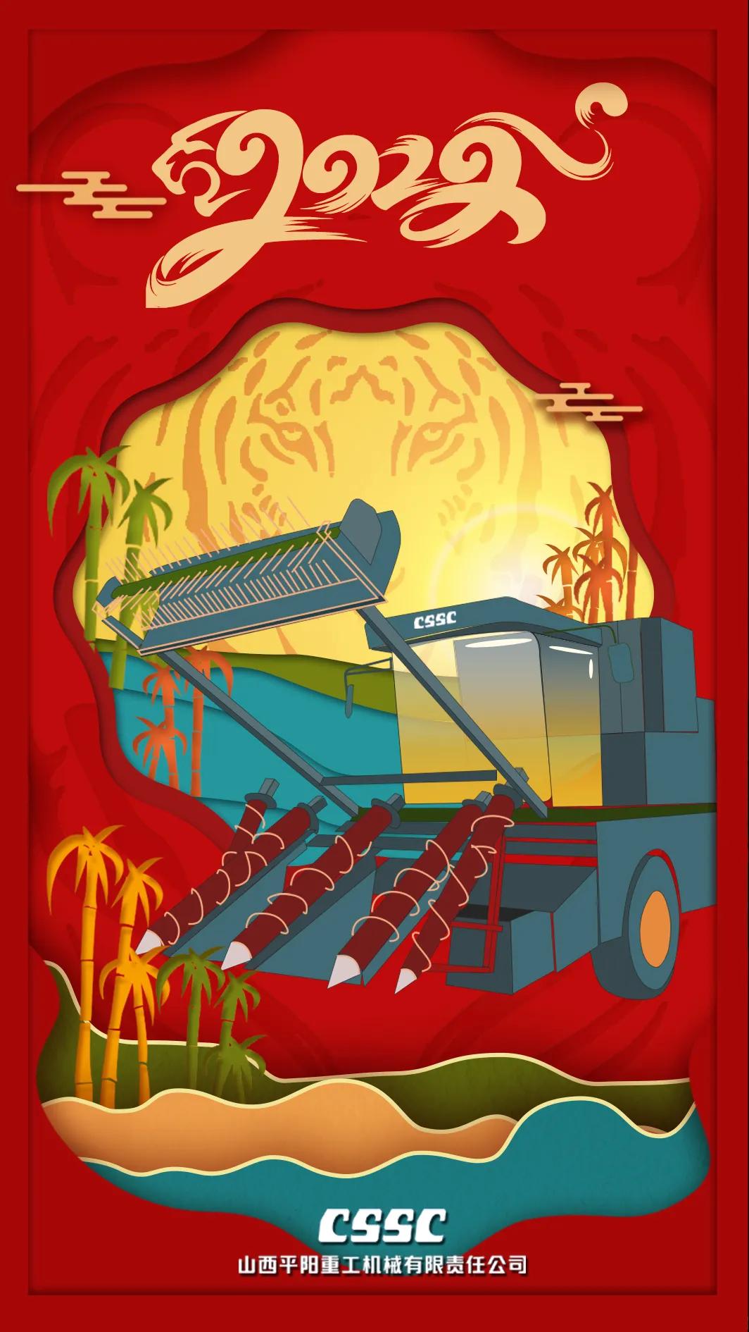 海報(bào)采用剪紙風(fēng)格,層層遞進(jìn)的縱深感傳遞著平陽人不斷探索創(chuàng)新的拼搏精神;海報(bào)主體為平陽重工新產(chǎn)品——甘蔗收獲機(jī),展示著平陽風(fēng)采;海報(bào)以“虎紋”為背景,以紅色為主色調(diào),烘托出虎年的喜慶氛圍。