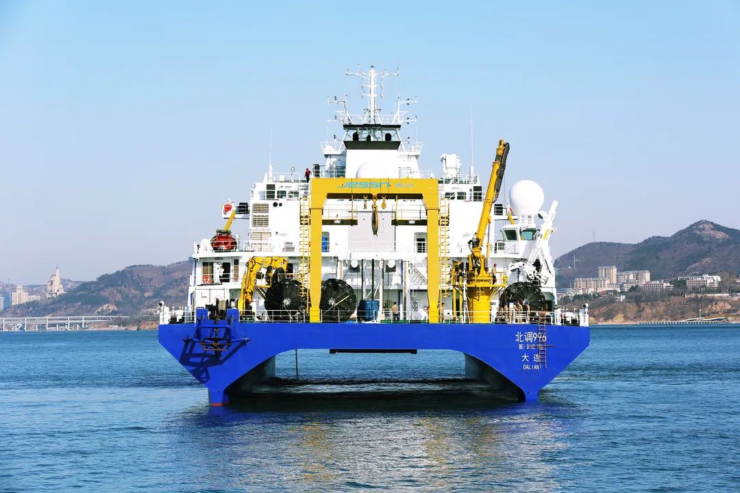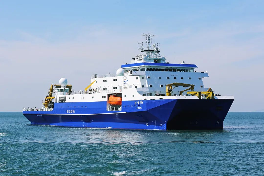 小水線面雙體船是一種水線面積小,且由兩個潛水體和一個水上箱體,中間有兩個流線型支柱連接起來的船舶。該船型耐波性好,能夠很好地解決深海作業浪大、波峰高等問題,利于在深海開展試驗工作。該船于2019年8月26日開工,2021年3月20日下水,2022年3月23日完工,歷時2年零7個月時間。該船總長99.8米,型寬32米,吃水7.5米,型深13.2米,航速15節,排水量6700噸。
