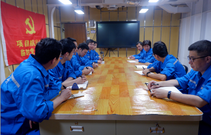 毛獻群在艦上同項目組成員一起討論技術(shù)問題