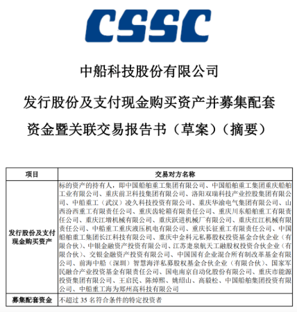 據了解,中船科技于9月30日召開了第9屆董事會第12次會議,審議通過了《發行股份及支付現金購買資產并募集配套資金暨關聯交易報告書(草案)》等相關議案。