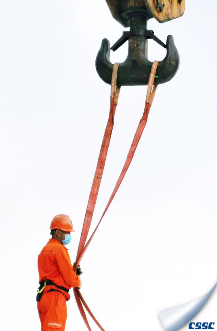 一名船舶起重工正在準備起吊直徑10米、重約5噸的玻璃鋼材質頂部圓盤至船舶上安裝,正值“梅花”過境后的陰雨天氣,身穿橙色工作服的船舶起重工在橙色吊帶、玻璃鋼材質圓盤以及灰色天空下,構筑了一幅簡約而又濃墨重彩的線條與內容相輔相成,彰顯了船舶工業之美、勞動光榮之美。