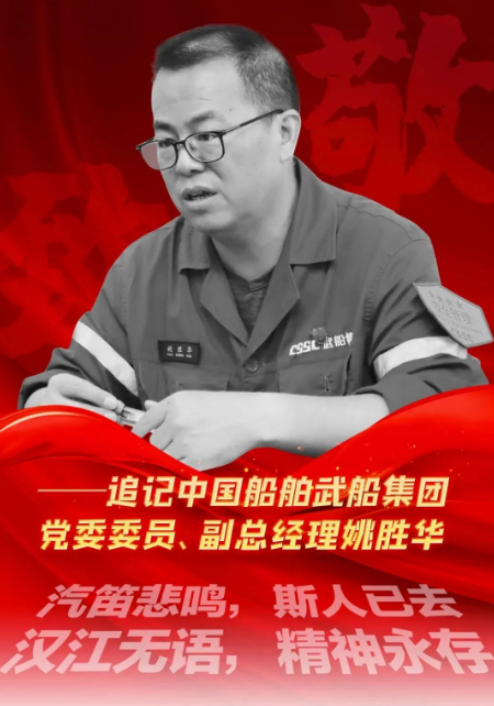 汽笛悲鳴,斯人已去;漢江無語,精神永存。中國船舶集團有限公司旗下武昌船舶重工集團有限公司黨委委員、副總經理姚勝華,一位沉默、訥言的人,他把自己熬干了、燃盡了,默默地用理想和信念、用忠誠和熱血、用苦干與實干鑄就的,是一座偉大的豐碑!他的精神就像一面高高飄揚的旗幟,跨越時空,熠熠生輝!
