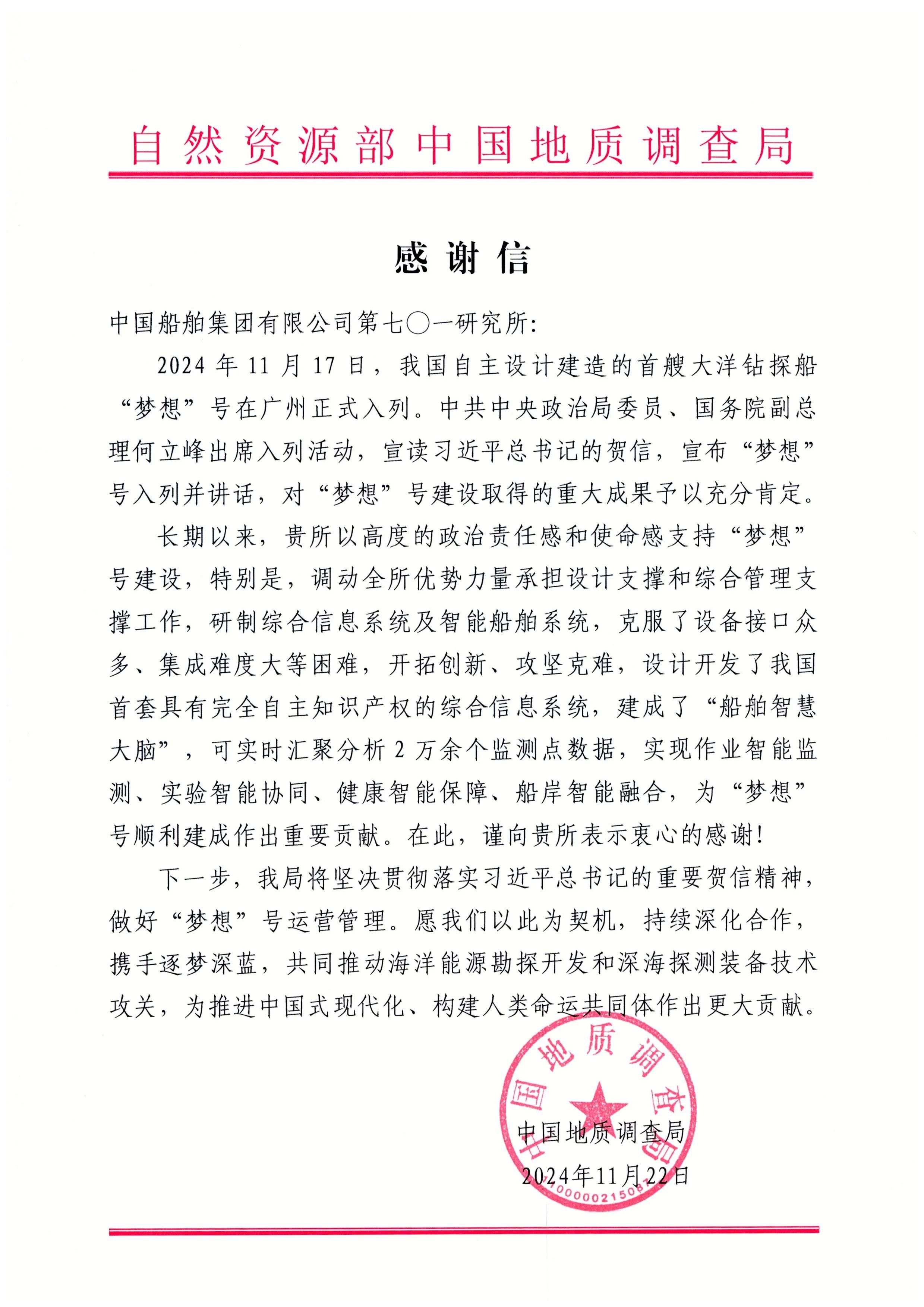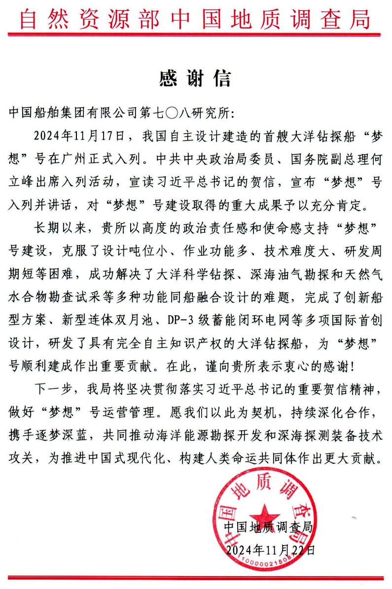 中國地質(zhì)調(diào)查局在信中對中國船舶集團七〇八所在“夢想”號立項論證、研發(fā)設計、建造調(diào)試等階段所做的突出工作和卓越貢獻表示感謝。