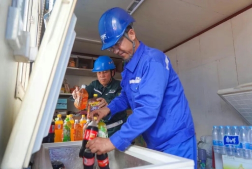 在飲食消暑保障上,大船天津構建起全鏈條清涼補給體系。清涼解暑的綠豆湯成為員工餐桌上的“標配”,供隨餐飲用;4000余箱瓶裝水以及大批藿香正氣水作為夏季防暑降溫物資配送至各部門、各協作單位班組;作業現場的冰柜里,清涼飲品隨時待取;為協作單位員工送上遮陽草帽,讓清涼關懷覆蓋每一位一線勞動者。