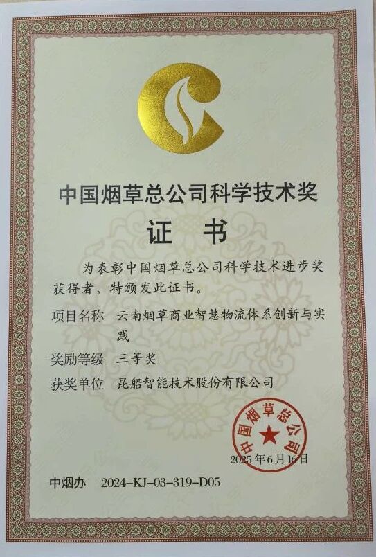 近日,中船集團旗下昆船公司所屬昆船智能協同相關單位及高校申報的“云南煙草商業智慧物流體系創新與實踐”項目成果獲得中國煙草總公司科技進步獎三等獎。