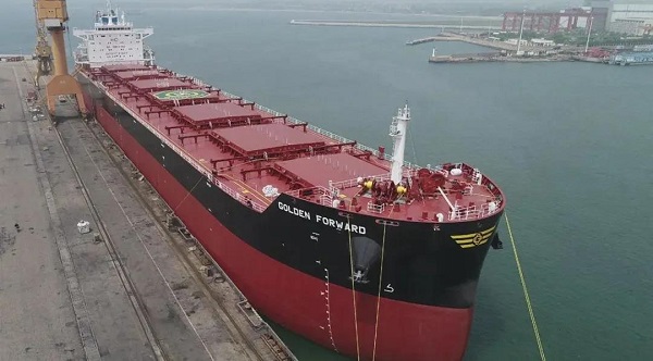 6月11日,由中國船舶集團(tuán)旗下大船集團(tuán)山船重工建造,中船貿(mào)易作為聯(lián)合賣方,為挪威Frontline公司打造的8.2萬噸散貨船“GOLDEN FORWARD”號交付離廠。