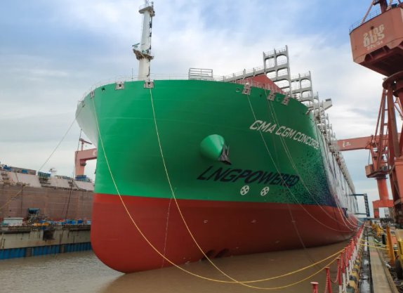 23000箱液化天然氣動力集裝箱船2號船緩緩駛離碼頭,按期開始常規試航。相比首制船,2號船試航完整性更好,碼頭周期進一步縮短。