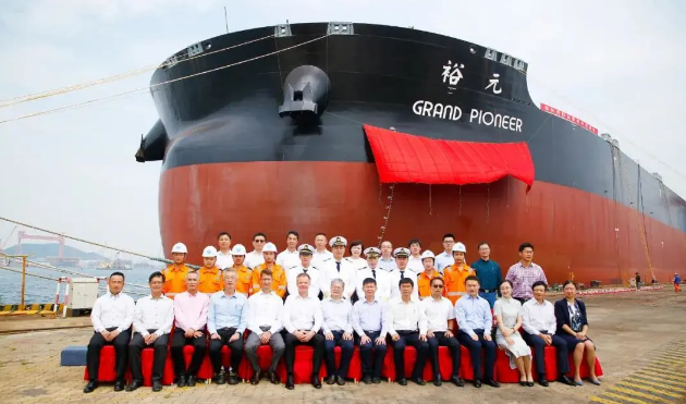 武船集團北船重工為工銀租賃和招商輪船建造的32.5萬噸礦砂船4號船“ORE CHONGQING”號命名暨交船儀式在3號碼頭舉行。
