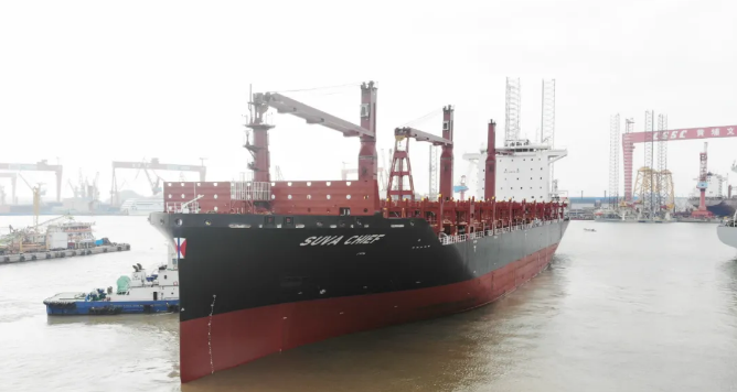 1月4日上午,交付的“SUVA CHIEF”號,這是黃埔文沖攜手中船貿易為新加坡太古公司建造的2750TEU集裝箱船3號船。