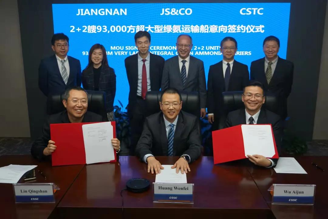 12月10日,中國船舶集團旗下江南造船攜手貿易公司與JS & Co視頻簽署了2+2艘93000立方米超大型綠氨運輸船(VLAC)合作備忘錄。