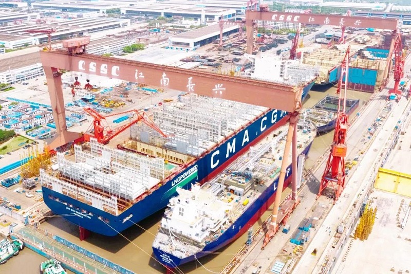 ????眾所周知,船塢是船舶總組搭載的場所,是造船生產(chǎn)的核心資源。江南造船3號船塢長580米、寬120米,是目前國內(nèi)在用的最大船塢。為提升船塢利用效率,江南造船采取“雙線并造”模式,即一批次液化氣船和一批次超大型集裝箱船同時建造。此次雙船出塢是江南造船“雙線并造”模式的第五個批次,也是今年3號塢出塢的第二個批次。