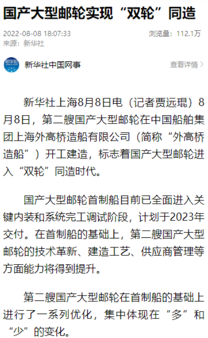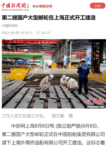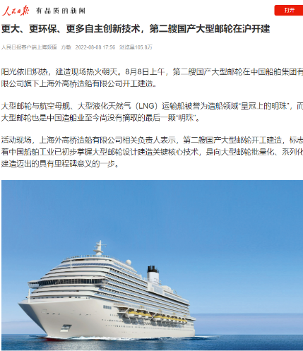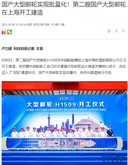8月8日,第二艘國產(chǎn)大型郵輪在中國船舶集團(tuán)旗下外高橋造船開建,這標(biāo)志著中國船舶工業(yè)已初步掌握大型郵輪設(shè)計(jì)建造關(guān)鍵核心技術(shù)。
