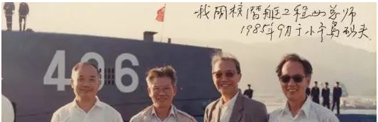 ▲黃旭華(右一)在“406”號彈道導彈核潛艇前的留影