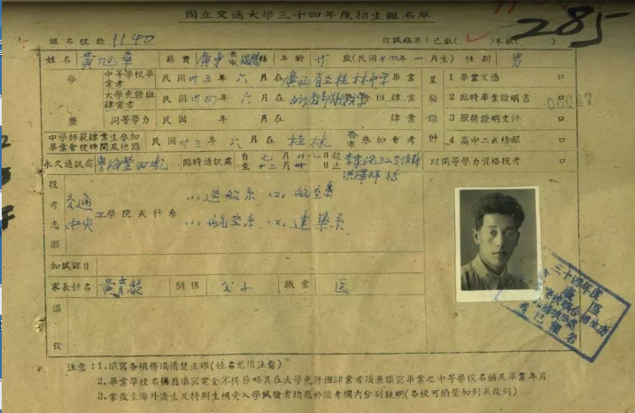“國立交通大學”這所當時在科學技術領域全國首屈一指的學術殿堂,在黃旭華心中是神圣而遙遠的。以至于當真正有機會填寫被保送大學的名字時,他竟然沒有勇氣填上“國立交通大學”的名字,只填上了一個中央大學的航空系。