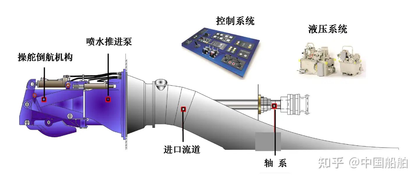 噴水推進裝置工作時,噴水推進泵的核心葉輪以每分鐘數千轉的速度切割水流,恰似高速旋轉的“風火輪”,將數噸水流由船尾方向噴射出去,推動船舶踏浪前行,當需要快速實現船舶或載體平臺的轉向和倒退時,只需要通過操縱舵倒航機構分配和改變噴口水流方向即可。